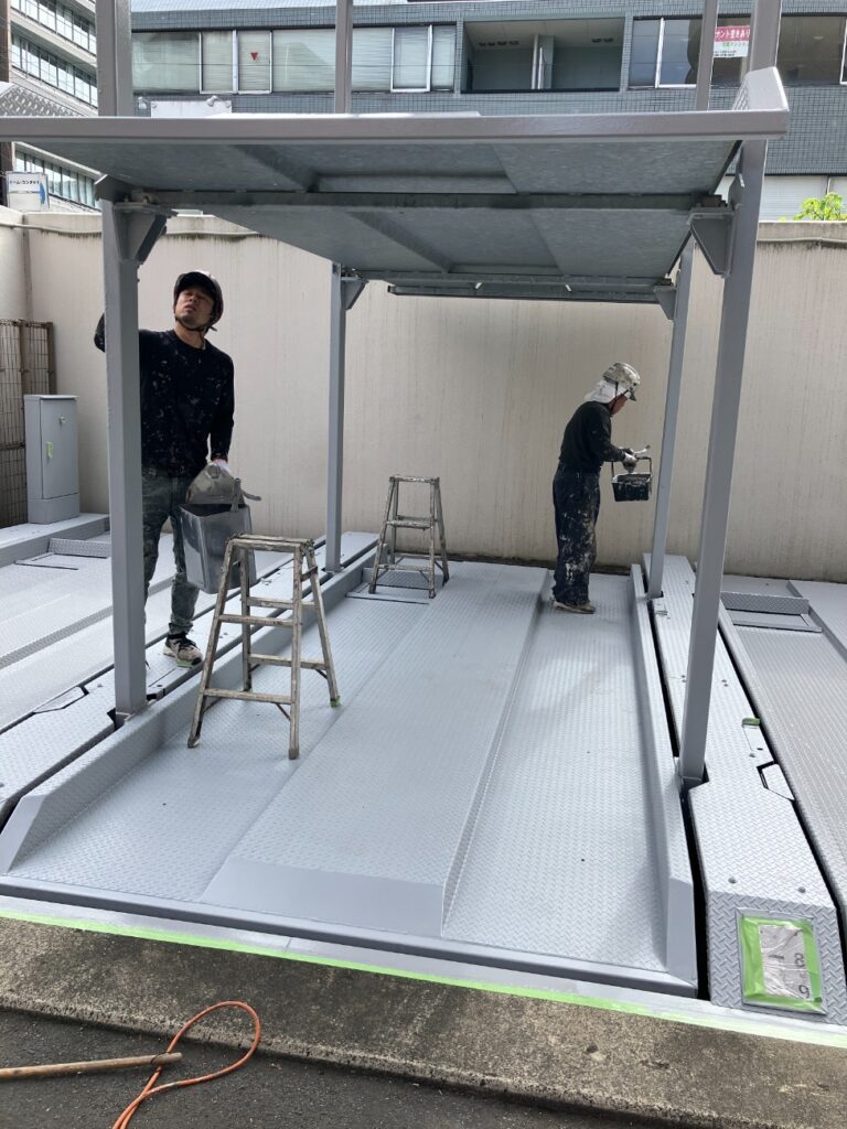 マンションの機械式駐車場を塗装しています|安全性と耐久性を取り戻すための大切な作業