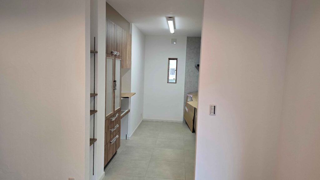 新築の真っ白な空間に、自然素材の壁が加わることで、住まい全体がぐっと温かみのある雰囲気に変わっていきます。