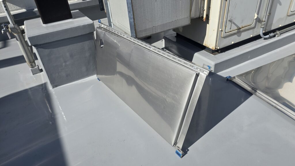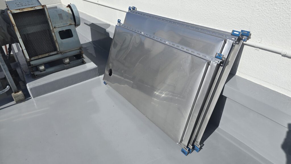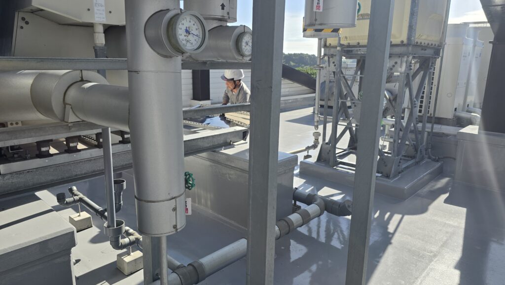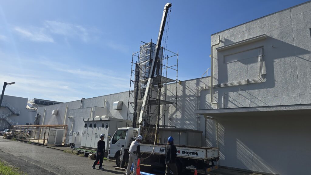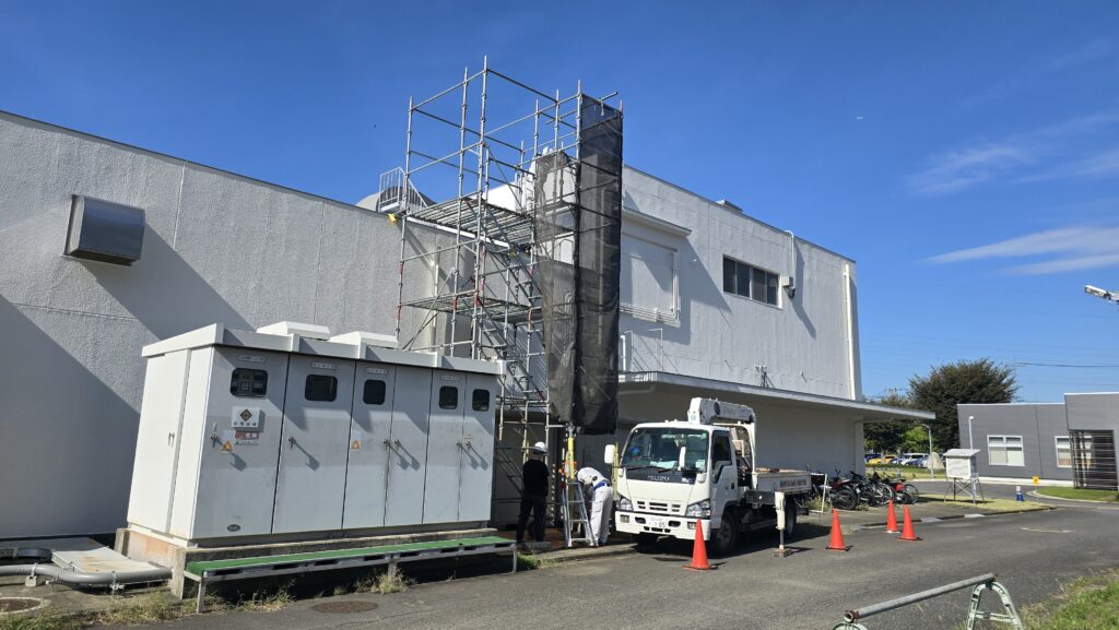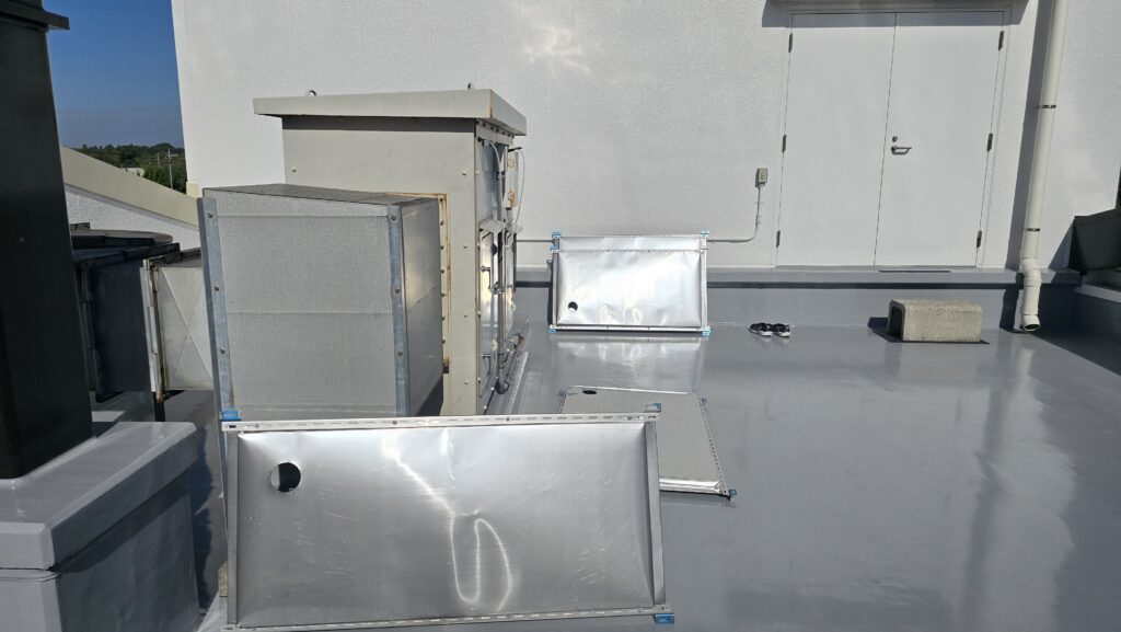 屋上ダクト配管改修工事の本工事は今日が初日です。