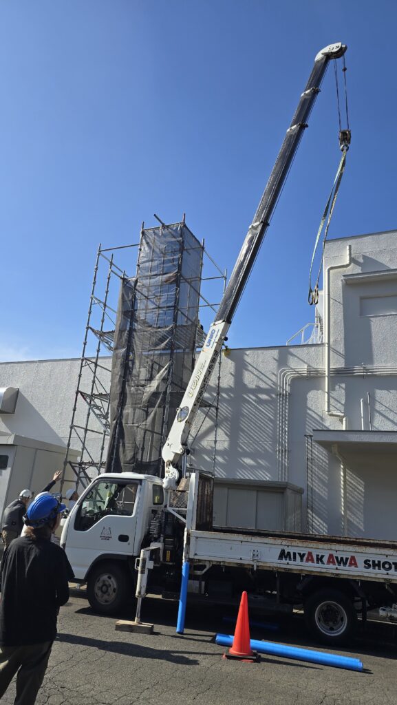 資材を揚げるためにウインチを足場に取り付けました。